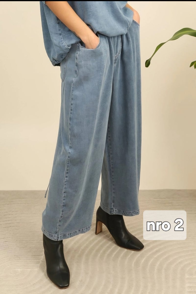 Rennon väljät vajaamittaiset denim farkut hyvin laskeutuvalla kankaalla. Joustovyötärö. Taskut sivulla, takana yksi tasku.
