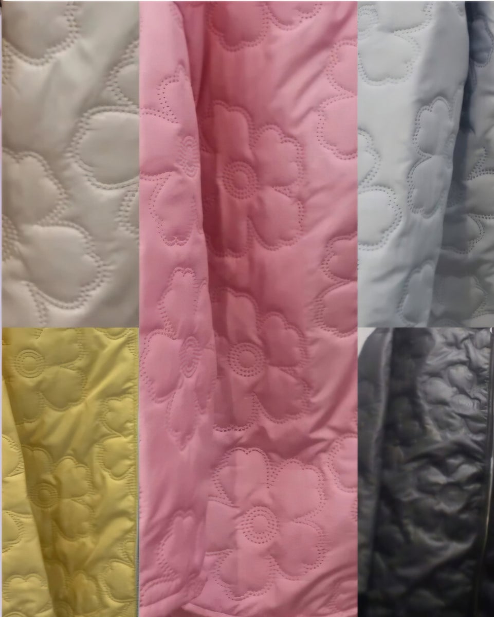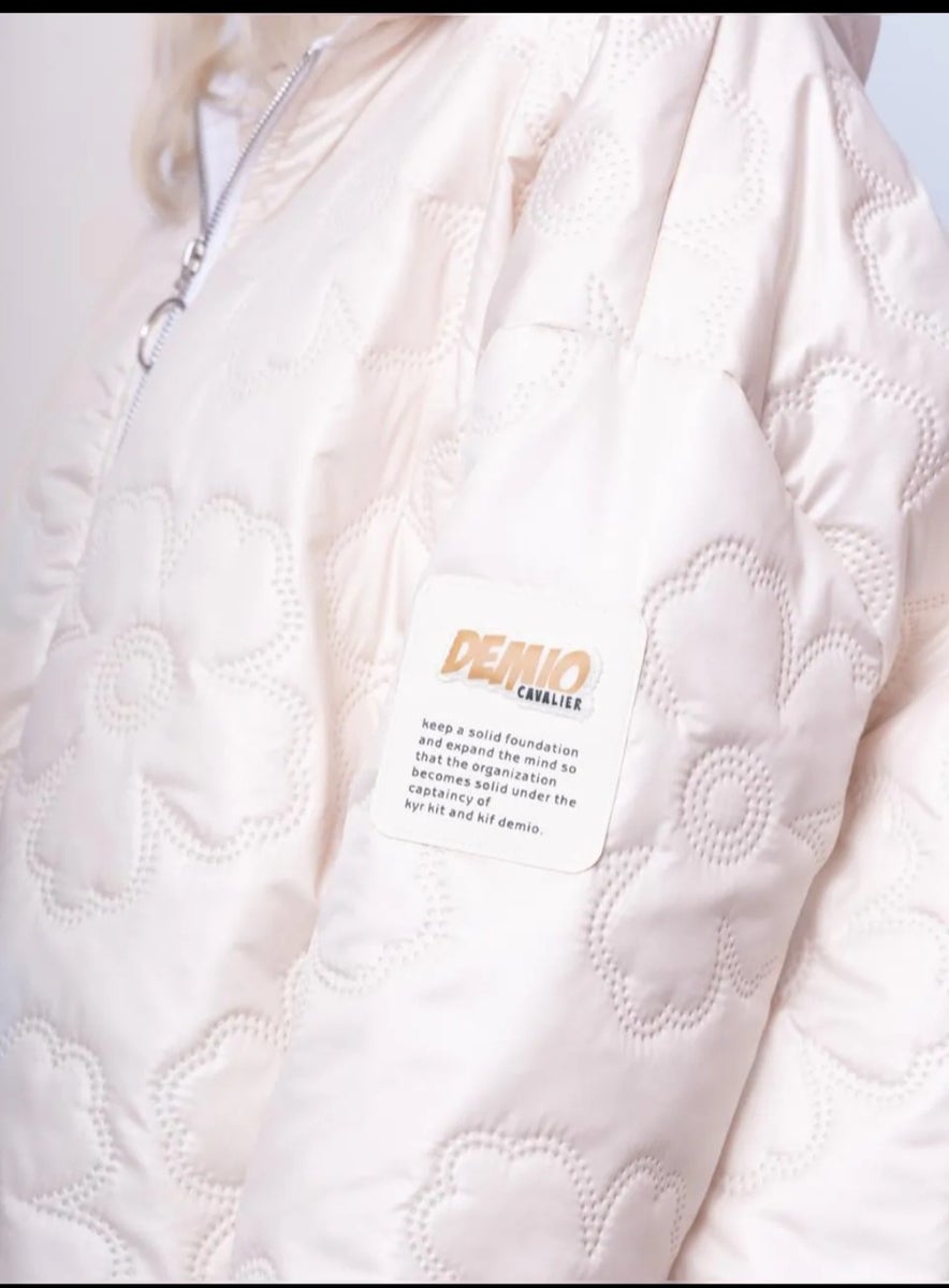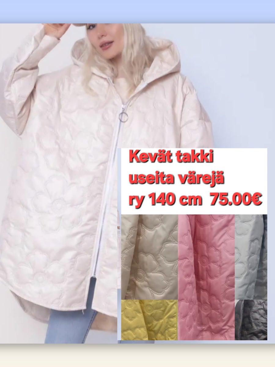 Kevät takki, jossa on hillitty tikattu kukkakuosi. Takissa on huppu, vetoketju ja taskut. Takaa pidempi helma.